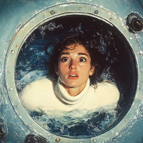 beautiful anxious 160 pound chilean woman in cream cashmere turtleneck leaving submarine by swimming upward via its escape hatch in its upper deck deep under the ocean. The water is murky.