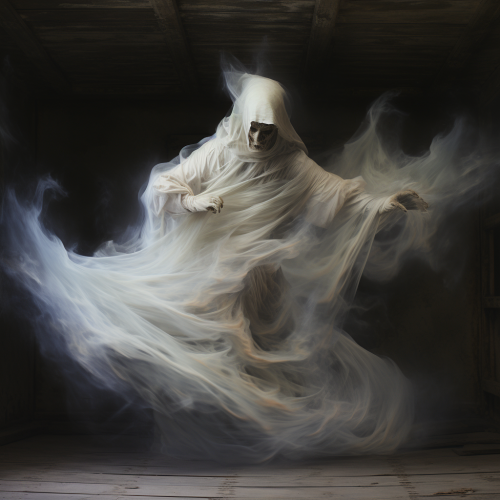 white ghost dancing on ashes, realistic, (vue de loin et au dessus)