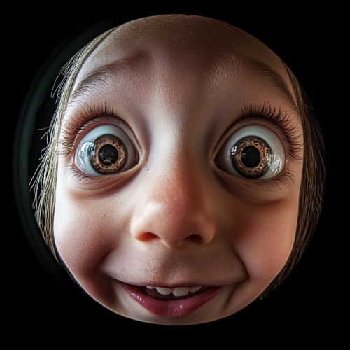 the calvaria of a kids head looking at the camera with eyes wide open, abnormally wide open eyes, smiling, cenital view, fish eye angle, realistic photograph --v 6.1