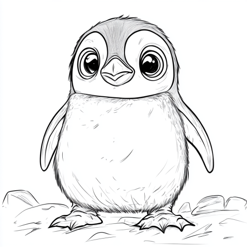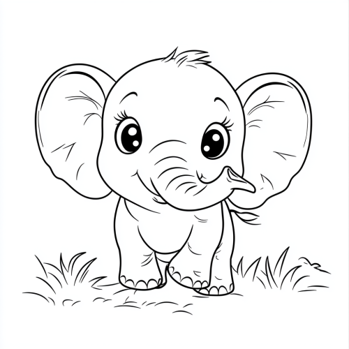 A cute elephant in its natural habitat with oversized head, round body, and large eyes,outlined in thick black ink on a white background, no shading, bold clear lines, children's coloring book page illustration