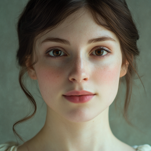 portrait of a twenty year old woman. The woman has symmetrical facial structures, doe-like, she has dark eyes, brown hair, an aquiline nose, a rosebud mouth and fair white skin. She blushes. Jane Austen style, realistic photo.
