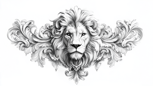 sketch for realistic tattoo in shadows of a realistic lion's head in the center, on the sides perfectly symmetrical baroque ornaments, white background --ar 16:9 --v 6.1