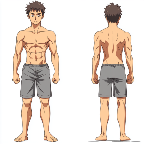 Generate a front-facing, full-body image of a male with a height of 160 cm. The head should be exaggeratedly large, accounting for roughly 1/5th of the entire body height. Make the neck noticeably shorter and thicker to fit the smaller stature. The torso should be compact and slightly wider relative to the body’s height. The arms and legs must be visibly shorter and more compact, especially the thighs and forearms. Ensure the overall figure looks stocky and compact, avoiding an elongated or slender appearance. The figure should clearly depart from standard 8-head-tall proportions, with a noticeable emphasis on the shorter limbs and larger head.