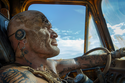 a driver of a a war rig from the mad max films. his face is covered in scars. he is bald and has a giant tumor growing out of his neck. he has tattooed a smiley face on the tumor. his head is leaned back and his eyes are closed and his tongue is out. giant truck. big rig. --ar 3:2 --v 6.0