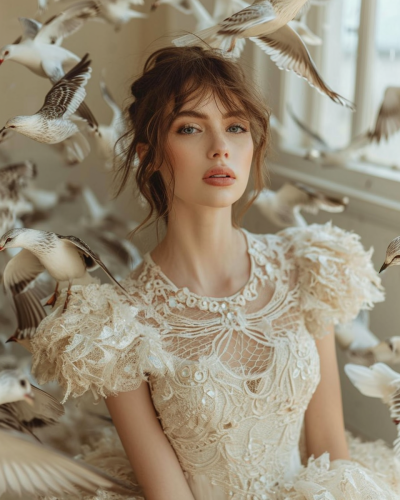 In this meticulously orchestrated fashion editorial, the essence of symmetry and minimalist sophistication pervades every aspect of the composition. The natural light casts a soft, ethereal glow, enhancing the atmosphere of serene simplicity. The scene unfolds within a series of architecturally symmetrical portals, each meticulously designed to create a sense of dimensionality and depth. The perspective of these portals is precise and geometric, evoking a sense of harmonious balance and order. At the heart of this symmetrical tableau stands the model, her static pose perfectly aligned with the architectural style surrounding her. With each room she enters, she maintains her poised stance, her presence seamlessly integrated into the architectural landscape. Her garments, ranging from deep black to vibrant purple to acid green, punctuate the scene with bursts of color against the backdrop of muted tones. Instead of wings, she is adorned with a trailing cloak crafted from strands of pearls, serpents, and acidic green algae, adding an otherworldly allure to her presence. As she moves through the interconnected chambers, her coordination with the architectural elements creates a mesmerizing visual harmony. The coexistence of model and architecture blurs the boundaries between art and reality, inviting the viewer into a realm where fashion becomes architecture, and architecture becomes fashion. realistic --ar 4:5 --v 6.0
