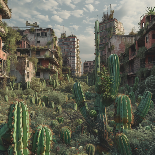 photorealistic image of a dystopian urban landscape densely overgrown with cacti --v 6.0