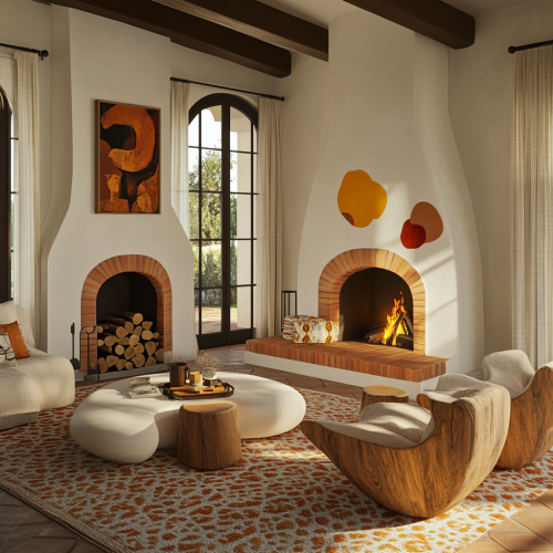 A spanish style living room circa 1920s hollywood, with fireplace, with organic modern furniture with irregular shapes, linen curtains, playful shapes, render, enscape --v 6.1