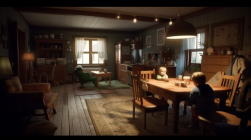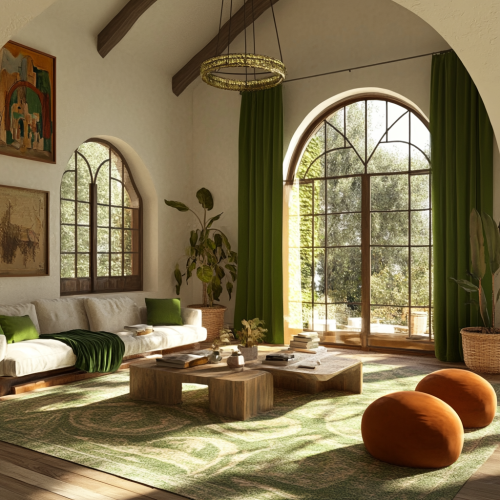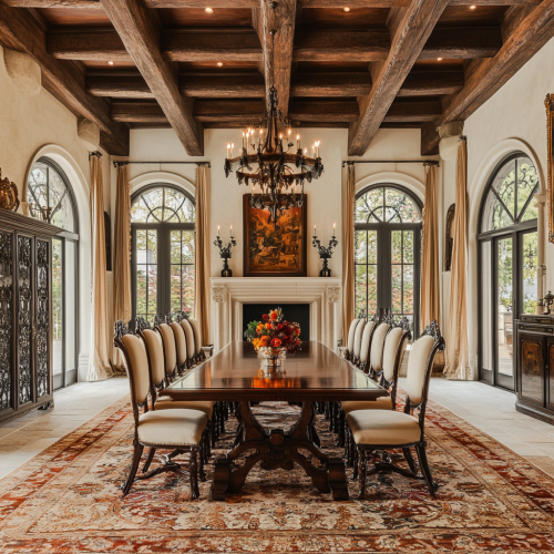 A grand, traditional dining room in a luxurious Spanish villa, with high, vaulted wood-beamed ceilings in dark mahogany, adding a rustic yet elegant charm. The walls are finished in cream stucco, adorned with Spanish-style archways leading to adjacent rooms. Large, arched windows with black wrought-iron detailing allow soft, natural light to fill the space, casting warm shadows across the room. At the center, a grand, long wooden dining table made from polished dark walnut comfortably seats twelve guests. The table is intricately carved along the edges, reflecting traditional Spanish craftsmanship. Each chair is upholstered in luxurious cream leather, with dark wooden frames and ornate carvings. The centerpiece of the table is a large arrangement of fresh flowers, in rich red and orange tones, placed in a terracotta vase. Above the dining table, a grand wrought-iron chandelier hangs, featuring candle-style lights, casting a warm, golden glow throughout the room. The chandelier is complemented by matching sconces on the walls, further illuminating the space with a soft, ambient light. The flooring is traditional terracotta tile with hand-painted Spanish motifs in warm, earthy tones, perfectly complementing the rustic wooden elements. A large, patterned rug in muted reds, golds, and browns is placed beneath the table, adding texture and warmth to the space. At one end of the room, a grand stone fireplace with a carved mantelpiece sits, its flames creating a cozy and inviting atmosphere. Above the fireplace, a large decorative mirror framed in wrought iron reflects the flickering firelight. On the mantelpiece, ornate candelabras and terracotta vases add to the room’s elegance. The walls are decorated with large, framed tapestries depicting traditional Spanish [...]