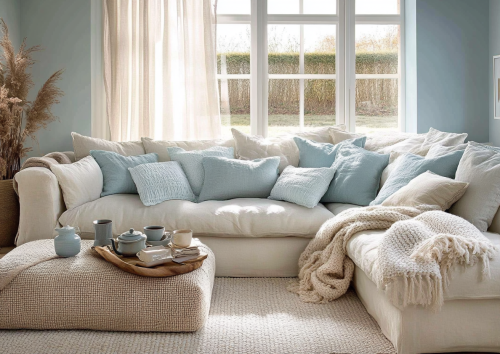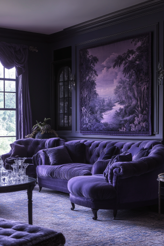 Capture a living room that uses the Twilight Tapestry theme, featuring a subtle twilight-inspired color palette with shades of dusky purple and deep blue. The room should have soft, plush furniture to encourage relaxation, complemented by lightweight, flowing curtains that move with the breeze. A central tapestry depicting a twilight scene should serve as the focal point, supported by dim, mood-enhancing lighting. Accents like silver candle holders and crystal vases would add a touch of sparkle. The image should be taken to emphasize the serene and dreamy quality of the twilight theme, inviting viewers to imagine unwinding in such a peaceful setting. Camera: DSLR - Canon EOS 5D Mark IV. Lens: Canon EF 24-70mm f/2.8L II USM. Composition: Wide shot, room-centered, horizontal orientation, balance between furniture and space. Film: Digital, high resolution, color profile sRGB. Camera settings: ISO 400, f/2.8, 1/60 sec. --ar 2:3 --v 6.1 --s 250
