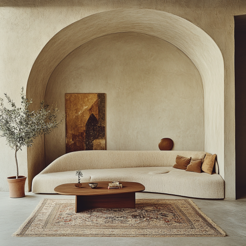 : a editorial photo shoot of a modern and minimalistic living room, featuring a curved sofa with a coffee table, rug underneath it, accent arch wall, small potted plant, studio lighting, beige background, painting on the wall, ultra-realistic photography