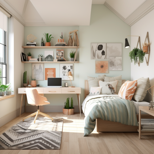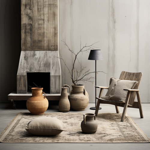 furniture mood board, farmhouse style, concrete, light wood, dark persian carpet --s 250