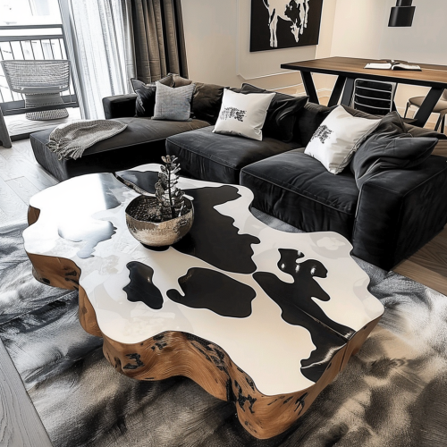 create a giant cow skin color epoxy center table position in the living room include black sofa and white pillow incorporating the color of cows, make it stunning