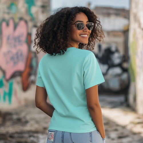 A women wearing plain black unisex t-shirt in an urban wide area settings, showing the back of the t-shirt, modelling for t-shirt mock-up, close-up shots.