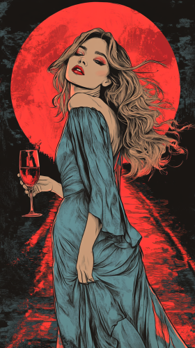 hand drawn style image with dominant black and red colors, featured, beautiful woman, long wavy hair, red lipstick, long sleeve spiritual blue dress, holding a glass of wine, walking on a dark road, moon in the background, spiritual atmosphere, hand drawn style, focus on black and red colors, focus on every detail, sharp details, high quality, high quality graphics, 4k, artstation --v 6.1 --ar 9:16