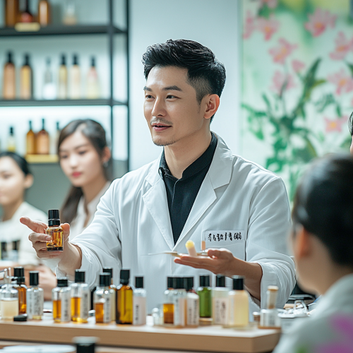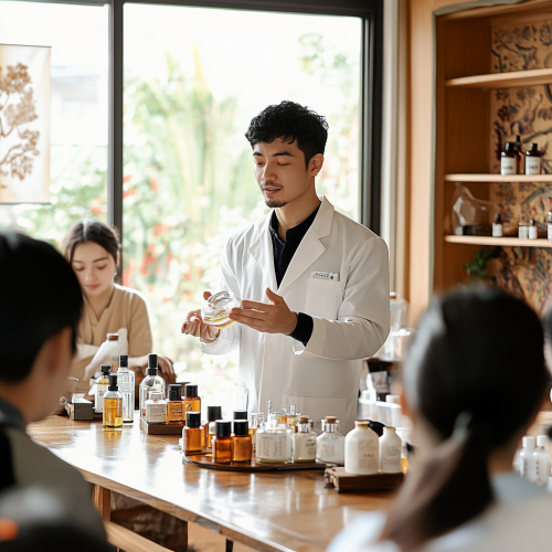 A Taiwanese fragrance instructor teaching a group of students in a modern classroom, the instructor is a professional with short black hair, wearing a neat white coat, guiding students through the art of blending perfumes, essential oil bottles and tools on the table, surrounded by eager Taiwanese students engaged in learning, soft natural light flooding the room, traditional Taiwanese motifs subtly decorating the walls, creating a warm and professional atmosphere, captured with high detail and a creative, educational tone