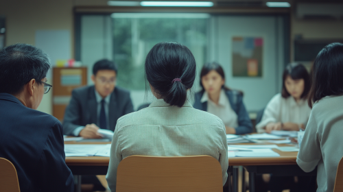 Background of a conference room in a Taiwanese school. The focus is on a small meeting table surrounded by five or six middle-aged teachers and committee members, all dressed in formal attire. The nearest teacher is viewed from behind, facing away from the camera, while the others have serious, focused expressions. The table is covered with documents, capturing the intensity of their discussion , with high detail and historical accuracy ,photograph --ar 16:9