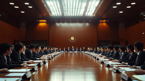 Background of a conference room in a Taiwanese school. The focus is on a small meeting table surrounded by five or six middle-aged teachers and committee members, all dressed in formal attire. Their expressions are serious and focused as they engage in a deep discussion. The table is covered with documents, emphasizing the importance of their meeting, with high detail and historical accuracy ,photograph --ar 16:9