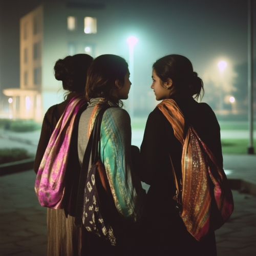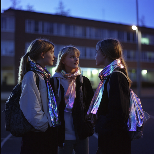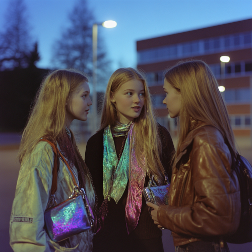 Three teenage scandinavian girls standing together outside their school at night, engaged in a casual conversation. Each girl carries a shoulder purse with a smal silk scarf tied to the strap where the strap meets the bag. The scarves have reflective and color full, iridescent colors that catch and shimmer in the dim evening light. The school building looms quietly in the background, with a few faint lights illuminating the scene. The mood is warm and friendly, capturing the bond of friendship on a quiet evening