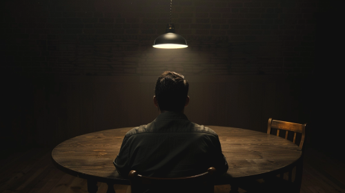 back of dark hair 40 year old man sitting at a round confernce table in a dark room with one dim light above head --fast --ar 16:9 --stylize 50 --v 6.0