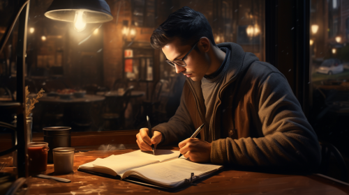 a man writing in his journal, journal, journaling, photorealistic, --ar 16:9