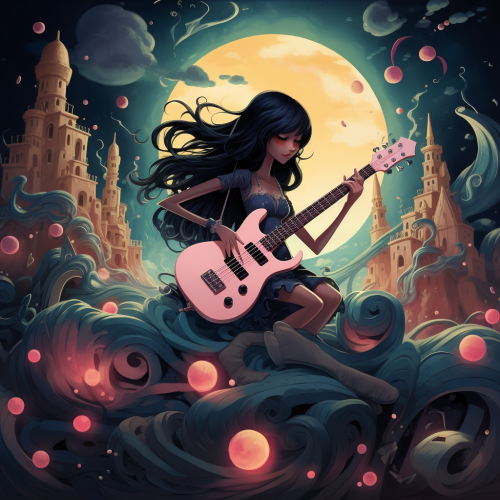 Marceline Abadeer, soaring over a moonlit landscape of Ooo, her bass guitar glowing with a mystic aura. Below her, the Candy Kingdom sleeps, unaware of the ethereal melodies she strums, summoning ghostly apparitions and night creatures to dance in the night