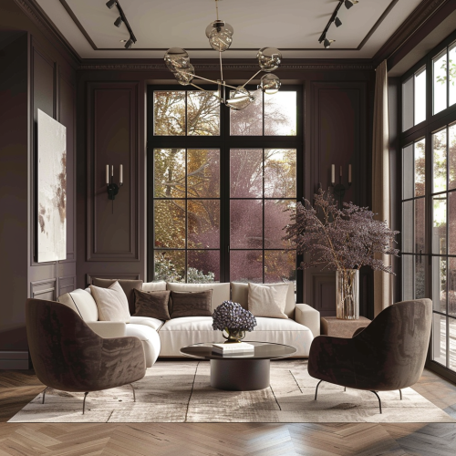 Old money luxury modern organic dining room. A whole room. Olive green accent walls with wall molding. Black lined floor to ceiling windows. Minimalist abstract cream art above cream sideboard. Wall sconces. modern dining taupe chairs. Large dining table with candles, wine bottles and plates. Modern area rug. tall green tree in the corner with sky light. tall large vase of brown orange maple flower stems. Dark brown oak floors. rectangular crystal chandelier. Layer the room with accent pieces. Realistic style --ar 1:1 --v 6.0 --s 250 --style raw