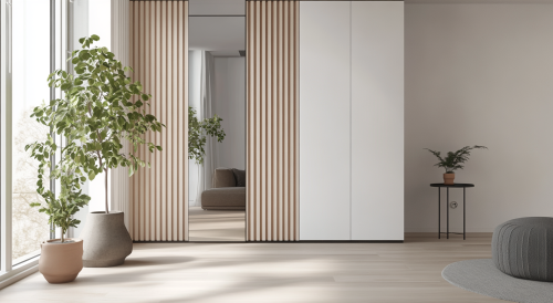 modern sliding wardrobe with a mirror design, featuring a white and gold interior, just as described. The light tones and elegant decor give it a sleek and luxurious look--s 750 --ar 4:1