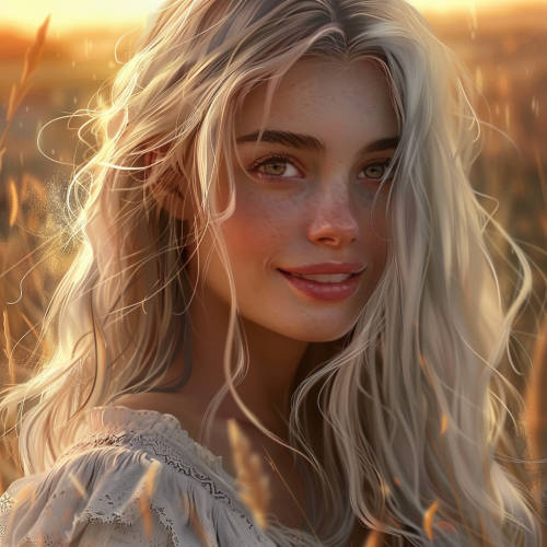 A soft semi-realistic illustration of a beautiful 20 year old woman with fair skin and long, flowing silver hair. She is smiling slightly, her eyes warm and lambent. There is an almost fey aspect to her, she is graceful and very slender. Fantasy medieval setting, golden hour.