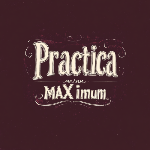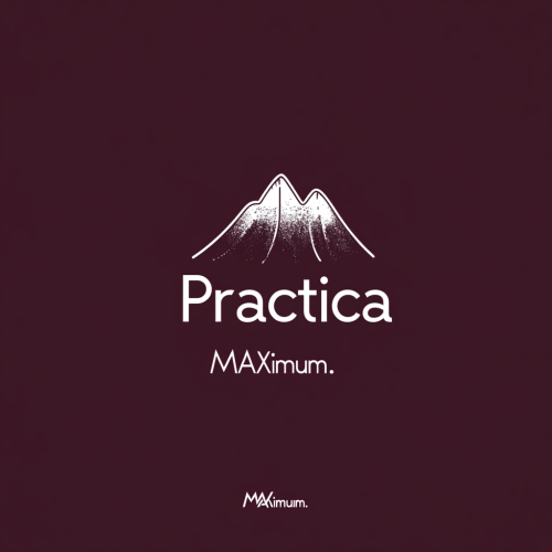 Draw a logo for a event, with the name "Practica" and the second word "MAXimum." Use a dark maroon background with light-colored text. The design should be in the style of the artist René Gruau from the 1950s, with a very simplistic and schematic illustration, without depicting any people.