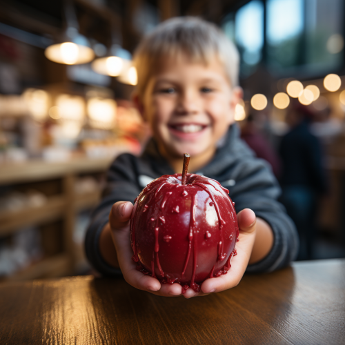 Little boy holding a bitten candy apple on his play puck. There are children playing in the background. hyper-detailed. use Canon eos R5 camera with a lens at F1.2 aperture setting to blur the background --v 5.2 --s 750 --style raw