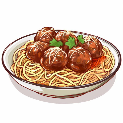 regular noodles with meatballs, in a deep plate, the image is for children, should be colorful and bright, the image should show the depth of the plate. --v 6.0