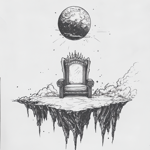 a fine line tattoo sketch of a view of earth from heaven's throne. On the throne there is a chair witha crown hovering over it. This tattoo should be minimalistic and earth should be far from it.