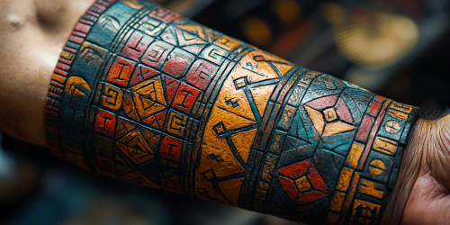 A design for an East African-inspired armband tattoo, heavily influenced by traditional Kenyan textile patterns. Focus on creating a symmetrical and continuous pattern with sharp geometric shapes like diamonds, chevrons, and interlocking lines. The primary color for patterns should be black. Incorporate bold accent colors--deep reds, blues, and greens--ensuring high contrast. The design should emphasize clear, precise line work and balanced spacing to ensure the tattoo wraps seamlessly around the arm. Include intricate detailing, and maintain cultural authenticity while achieving a visually striking, cohesive design. Style: tribal::2 , intricate::1.5 , bold::1 Format: armband tattoo. --ar 2:1 --q 2 --stylize 500 --seed 12345 --no background