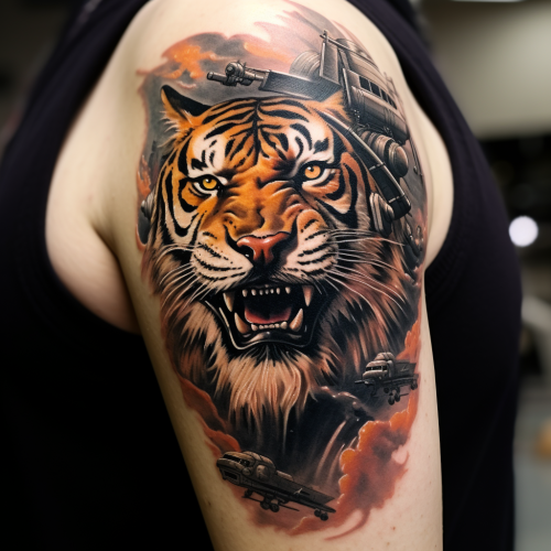 Create a highly detailed, realistic arm sleeve tattoo design inspired by Greek mythology. The sleeve should center around a Spartan warrior in the midst of an intense battle, his armor gleaming as he fights fiercely with a spear and shield. Surround him with imagery of ancient war: clashing swords, shields, and stormy skies. Include elements of Greek mythology, such as the gods watching from the clouds, Zeus with a lightning bolt, and Ares overseeing the chaos. The design should flow naturally down the arm, blending the Spartan’s valor with mythological power.
