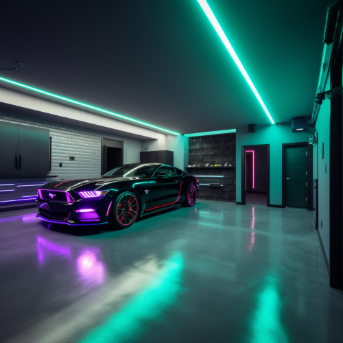 high-tech garage interior, vibrant LED spotlights, light and bright colors with subtle neon accents, sleek metal walls, detailed floor texture, modern industrial feel, no car --ar 1:1 --v 5.0