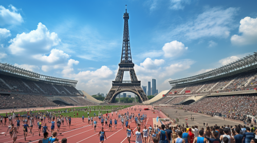 Image of the Eifeltower in Paris, with Olympic games athlets running 100m on a stadium in foreground. --ar 16:9 --style raw
