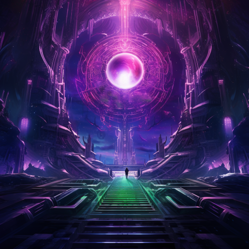 enter the mothership, psychedelic techno alien space station , purple green dark color tone , epic, abstract, with a big space rift