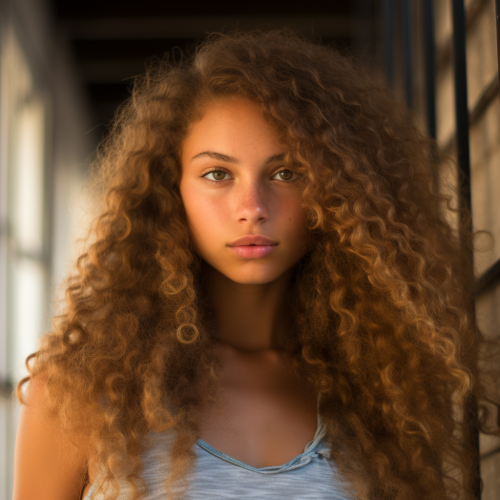 The most angelic blue eyed biracial teenager based on megan fox long flowy golden curly hair with Hyperdetailed photography, photorealistic. Canon EF 16 - 35mm f/ 2. 8L III USM lens on a Canon EOS 5D Mark IV camera