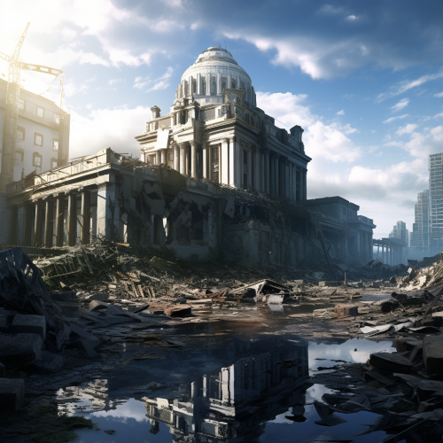 A desert, a city devastated by war, in ruins, with a flag with the symbol of peace stuck on top of a hill --v 5.0 --s 250