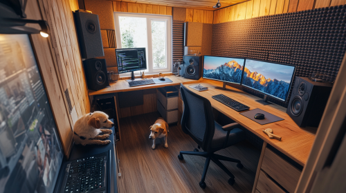 a small soundproof room with three desks inside, one desk is at the right wall with an imac studio on it, the other desk is on the left side wall near the corner with a pc, and another desk follows it in the upper corner with a macbook pro on it, and a small jack russel dog eating a bone on the ground, cinematic, 4k, octane render, --ar 16:9 --v 6.1