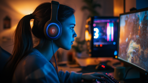 teenager playing pc games in his room on pc in the night, dark blue tones and cozy warm orange lights sources in backgroudn such as lamps, background should be blurry, shoot from hald profile angle, realistic photography, portrait photography, blue light from monitor illuminates his face, there should be retro 3d rendered game icons flying around him, commercial photoshoot, AD