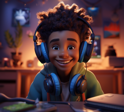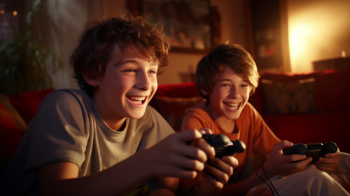 two 14 years old boys playing video games at home. happy atmosphere. Disney Pixar Style, --ar 16:9
