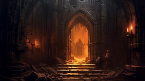 under catacombs , black door with rusty chiain abstract bones walls , dark ,arms , impaled people, small fire light in the dark, demonic monsters , Cleric fighter , combat with light versus demon , style diablo 1 video game ,Cleric pryest with book and mace combat versus dark demon with chains, catacombs gothic backgrounds, impalated enemys , videogame isometric view 2.5d --v 5.1 --ar 16:9