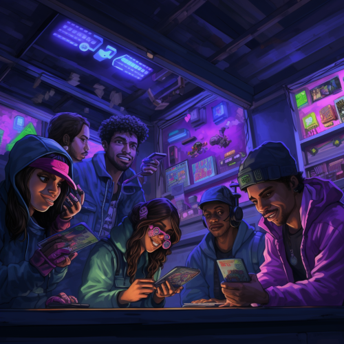 a group of ethnic friends playing videogames at a 5th dimension bar, holding controllers and looking at tv screens, neon green and purple, hints of orange