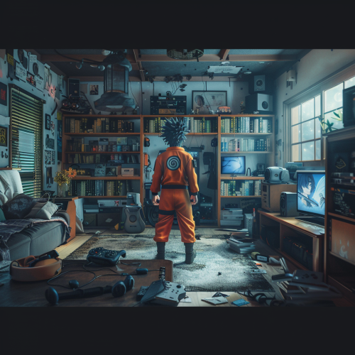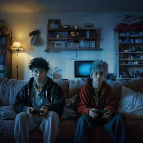 Movie still, documentary photography, editorial, in the style of Martin Parr: an off-centered shot of a group of two teenagers sitting on the floor of a bedroom, deeply engrossed in playing horror video games featuring zombies. The room is dimly lit, adorned with colorful Halloween lights that create a festive yet eerie atmosphere. Shadows dance on the walls, while the glow from the TV screen illuminates their focused faces. Gaming consoles and snacks are scattered around them, adding to the lively environment. High level of detail, vibrant colors, and a sense of excitement mixed with fear. Cinematic lighting, 35mm, intricate details --ar 16:9