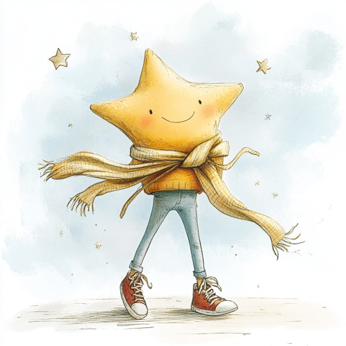 curious star wearing a scarf and sports shoes illustration, drawn in the style of Oliver Jeffers, soft light, pastel colors, children's book illustration , white background, landing on earth using scarf as a parachut
