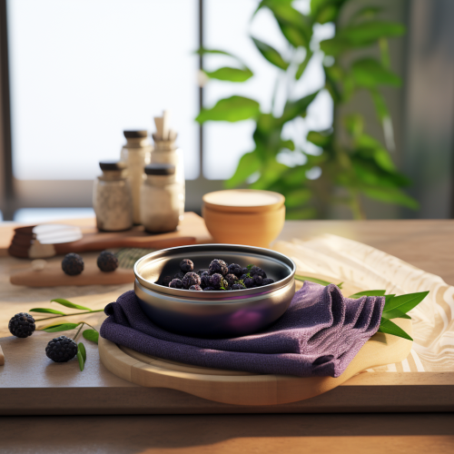 Photorealistic image of acai berry compress preparation. Visualize a kitchen counter with a steaming pot of boiling acai berries, a small dish of dried acai berries next to it, a cloth soaked in the acai mixture, and a decorative bamboo tray holding the finished compress with fresh acai berries and greenery. The setting is a modern kitchen with natural light.--v 6.0
