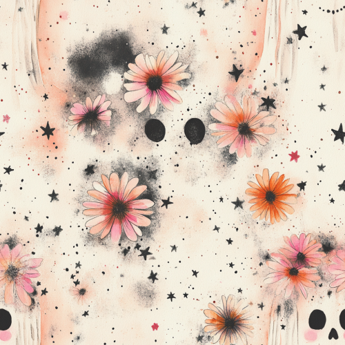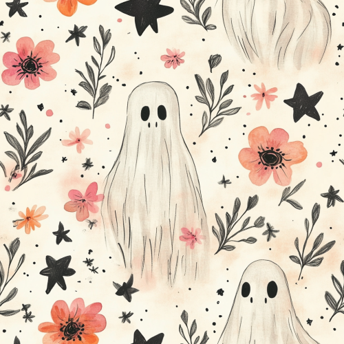 watercolor ghost with pink flowers on the head and stars pattern, pink, orange, creme and black colors, on creme background --style raw --tile --stylize 175 --v 6.1