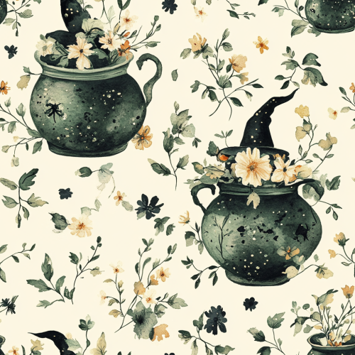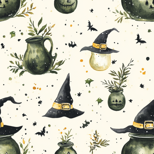 watercolor ghost with pink flowers on the head and stars pattern, pink, orange and black colors, on creme background --style raw --tile --stylize 175 --v 6.1