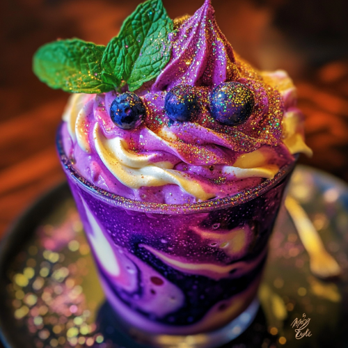 RECIPE NAME: Aurora Vanilla Swirl Ingredients: 2 cups vanilla ice cream 1 cup milk 1 teaspoon vanilla extract ¼ cup blueberry puree ¼ cup raspberry puree ¼ cup mango puree Edible glitter (optional) Fresh mint leaves for garnish (optional) | Amateur photo from reddit, taken with an iPhone 15 Pro. | SHOT TYPE: Macro Shot Focus on the details --ar 1:1